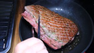 - Po jednej hodine mäso opečieme v panvici zo všetkých strán.
