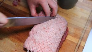 - Tuk na vrchu mäsa jemne z kríža narežeme,tak aby sme nezarezali do mäsa!