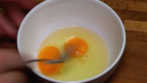 - Do rozohriateho woku pridáme sezamový olej,prilejeme vajíčka,opečie z oboch strán,potrháme vareškou a preložíme na tanier.