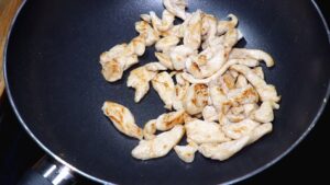 - Wok necháme opäť silno rozohriať,prilejeme sezamový olej a prudko orestujeme kuracie prsia,kým budú prepečené a preložíme na tanier k vajíčkam.